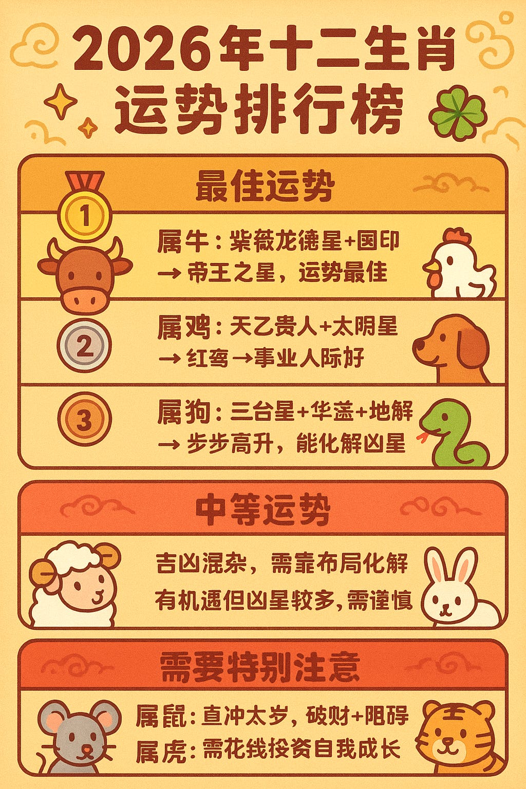 老师在直播上现场分析了十二生肖在2026年的排行榜。这是根据紫微斗数和各种吉凶星的组合排出来的。